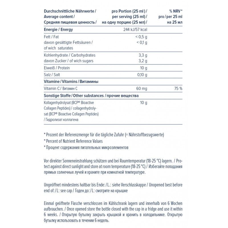 Склад: вода, гідролізат колагену, апельсиновий сік (з концентрату), фруктоза, регулятор кислотності (лимонна кислота), вітамін С, консерванти (сорбат калію, натрію бензоат), підсолоджувачі (стевіоглікозиди), ароматизатор. Містить підсолоджувачі.