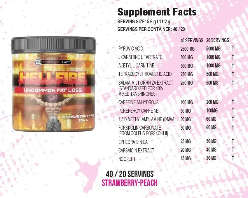 Renegade Labs Hellfire 40 serv - представляет собой энергетик-жиросжигатель, предназначенный для поддержки высокого энергетического уровня и процессов сжигания жира и во время физической активности. Ниже приведены общие особенности и возможные эффекты данного состава: