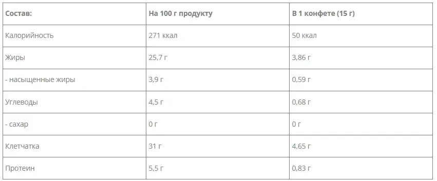 | На 100 g (г) продукту Per 100 gproduct | На 1 цукерку (15g (г)) Per 1 sweet (15g) | |